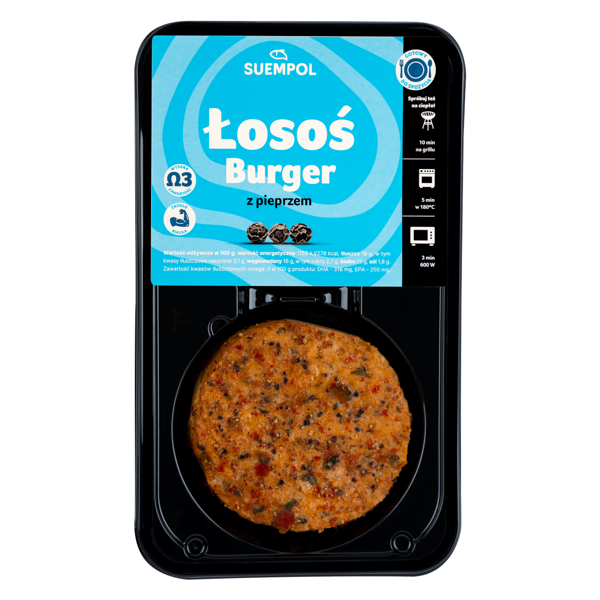 200 gBurger z łososia atlantyckiego z pieprzem czarnym, pieczony.
