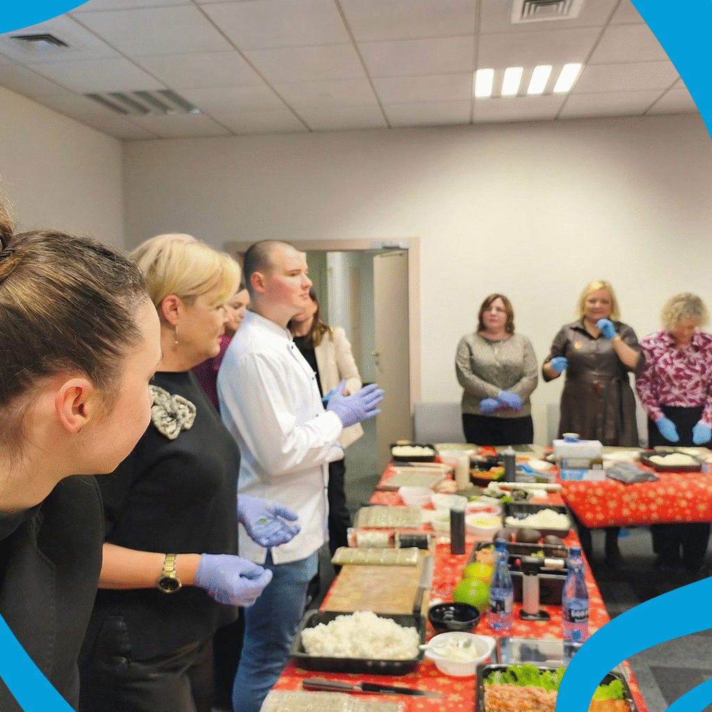W części praktycznej warsztatów uczestnicy spotkania uczyli się samodzielnie przygotowywać sushi, w tym kręcić rolki, poznając przy tym podstawowe techniki i zasady komponowania rolek i zestawów. Nie zabrakło również czasu na rozmowy i wymianę doświadczeń w swobodnej, przyjaznej atmosferze.